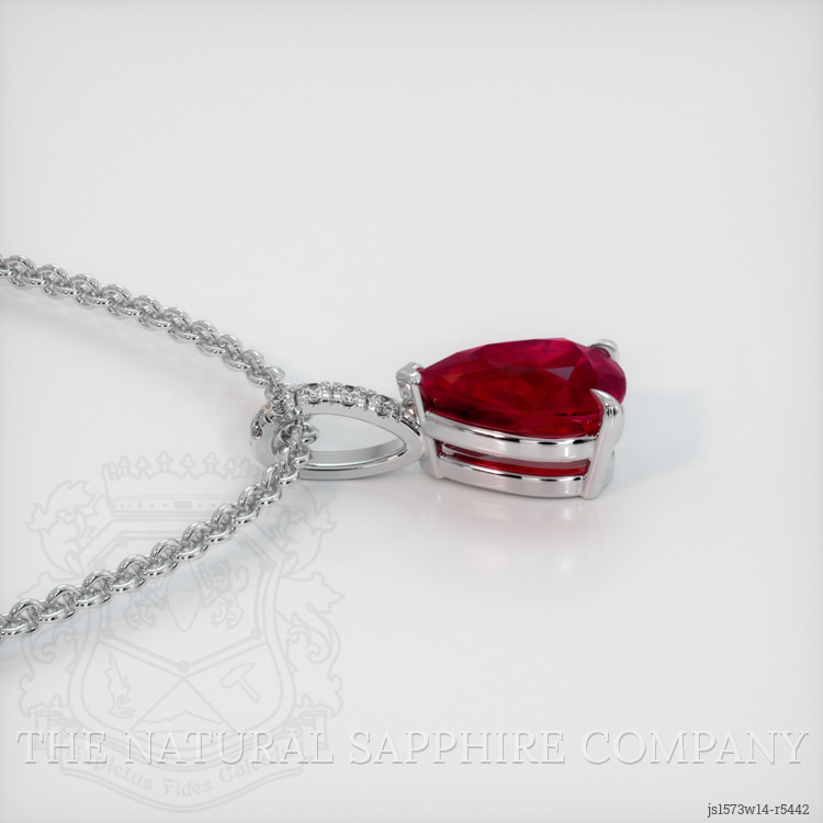 The pendant features a beautiful, transparent C.Dunaigre certified Intense Red 2.07 carat pear shape red ruby with the dimensions of 9.34 x 6.59 x 4.67 mm and a mixed brilliant cut. It has a clarity grade of very slightly included (evaluated at eye level), vivid color saturation, and an excellent polish. The origin of this ruby is Burma (Myanmar).