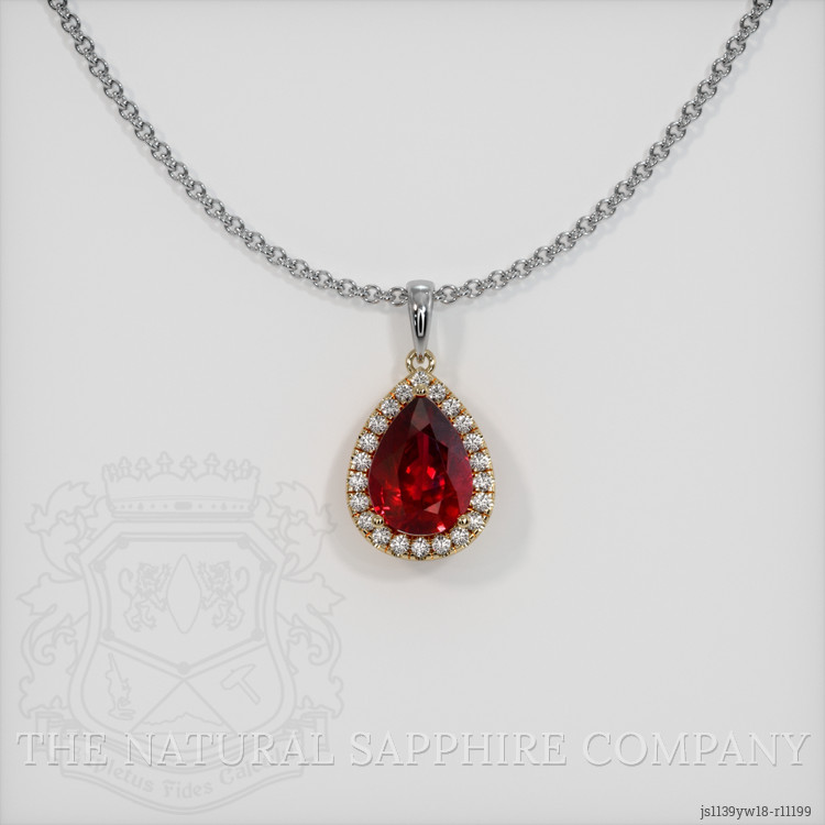 The pendant features a beautiful, transparent GRS certified Vivid Red “Pigeon’s Blood” 4.03 carat pear shape red ruby with the dimensions of 11.40 x 8.45 x 5.86 mm and a mixed brilliant cut. It has a clarity grade of eye clean (evaluated at eye level), vivid color saturation, and an excellent polish. The origin of this ruby is Mozambique.
