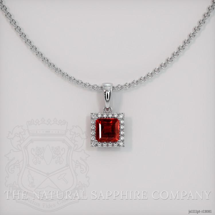 The pendant features a beautiful, transparent 0.40 carat princess shape red ruby with the dimensions of 3.95 x 3.94 x 2.46 mm and a princess cut. It has a clarity grade of very slightly included (evaluated at eye level), vivid color saturation, and an excellent polish. Enhancement: heat treated. The origin of this ruby is Madagascar.