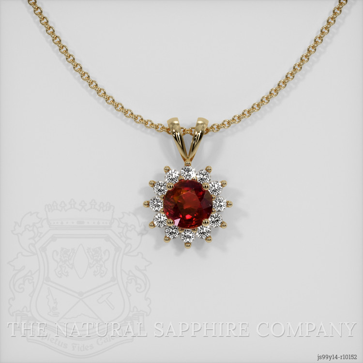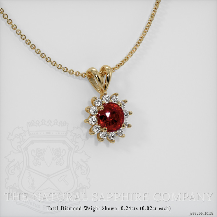 The pendant features a beautiful, transparent 0.62 carat round shape red ruby with the dimensions of 4.92 x 4.84 x 3.29 mm and a mixed brilliant cut. It has a clarity grade of slightly included (evaluated at eye level), vivid color saturation, and an excellent polish. The origin of this ruby is Mozambique.