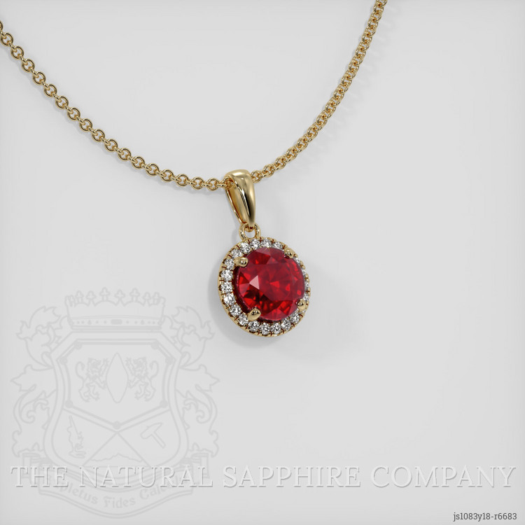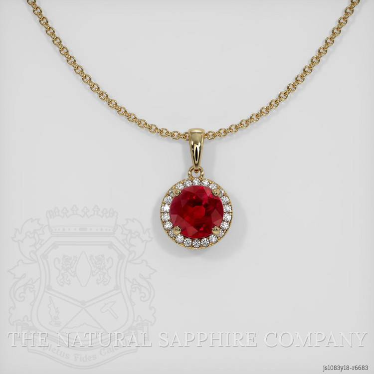 The pendant features a beautiful, transparent GRS certified Vivid Red “Pigeon’s Blood” 3.15 carat round shape red ruby with the dimensions of 8.42 x 8.26 x 5.29 mm and a brilliant cut. It has a clarity grade of slightly included (evaluated at eye level), vivid color saturation, and an excellent polish. The origin of this ruby is Burma (Myanmar).