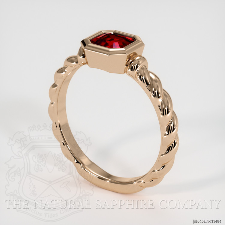 In the sunlit gardens of love and dreams, where every petal whispers secrets of the heart, emerges a creation of timeless grace. Nestled within the gentle embrace of 18K rose gold, this men's ring transcends mere adornment. It is a testament to enduring affection and emotional amplitude. The gleam of the rose gold band, delicate and warm, cradles a jewel of incomparable splendor, a transparent 0.89 carat asscher-cut ruby whose facets whisper tales of passion and romance.