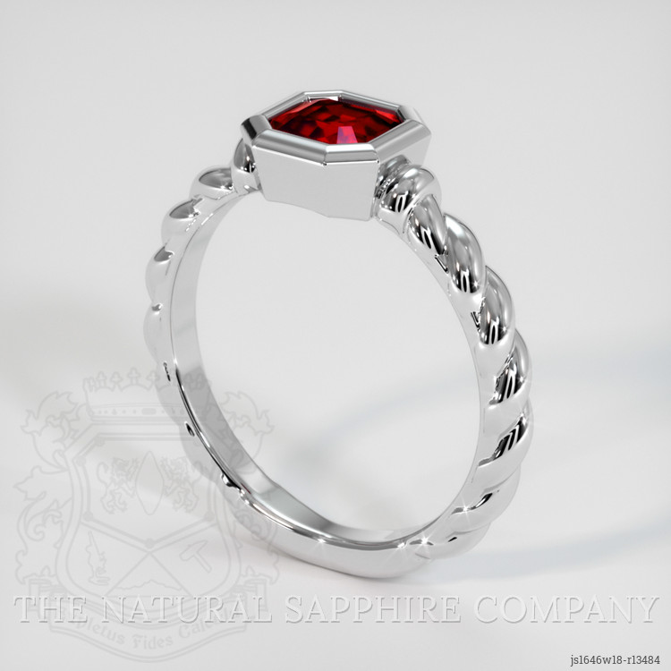 The men's ring features a beautiful, transparent 0.89 carat asscher - octagon shape red ruby with the dimensions of 5.37 x 5.18 x 3.53 mm and a asscher cut. It has a clarity grade of very slightly included (evaluated at eye level), vivid color saturation, and an excellent polish. The origin of this ruby is Mozambique.