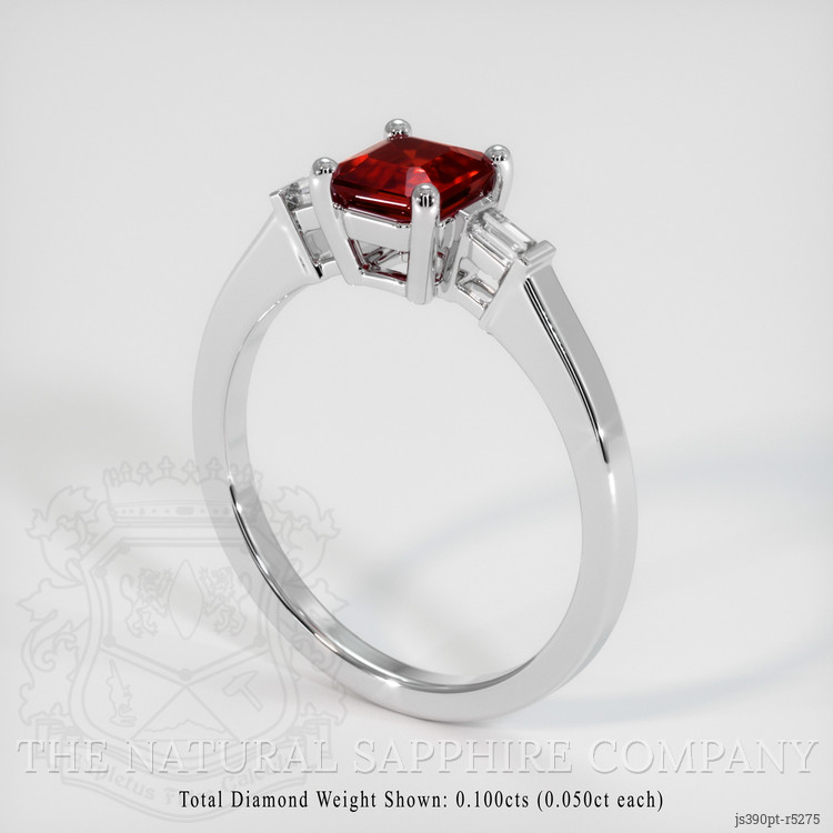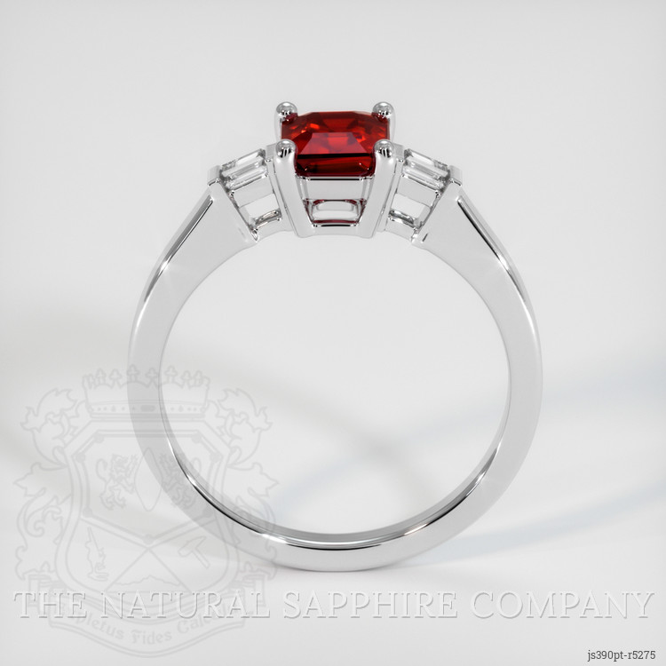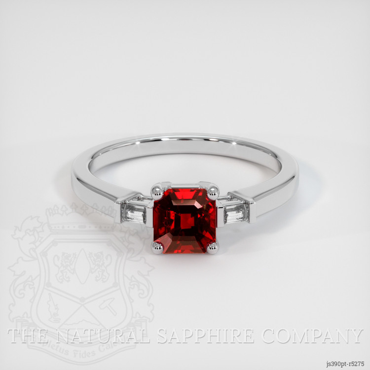 The ring features a beautiful, transparent 0.92 carat asscher shape red ruby with the dimensions of 5.37 x 5.25 x 3.56 mm and a step cut. It has a clarity grade of very slightly included (evaluated at eye level), vivid color saturation, and an excellent polish. The origin of this ruby is Mozambique.