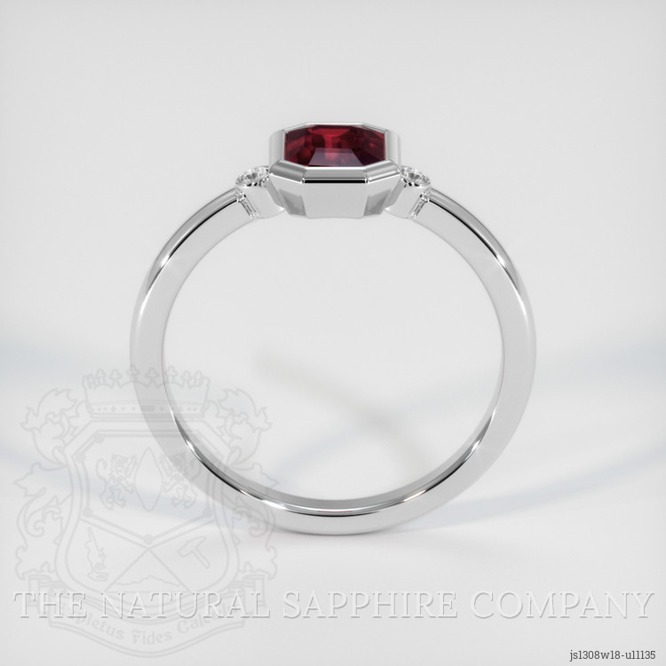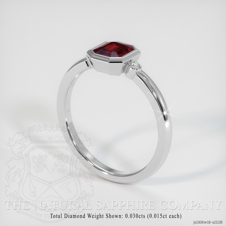 The ring features a beautiful, transparent 1.03 carat asscher - octagon shape red ruby with the dimensions of 5.86 x 5.43 x 2.88 mm and a asscher cut. It has a clarity grade of eye clean (evaluated at eye level), vivid color saturation, and an excellent polish. The origin of this ruby is Mozambique.