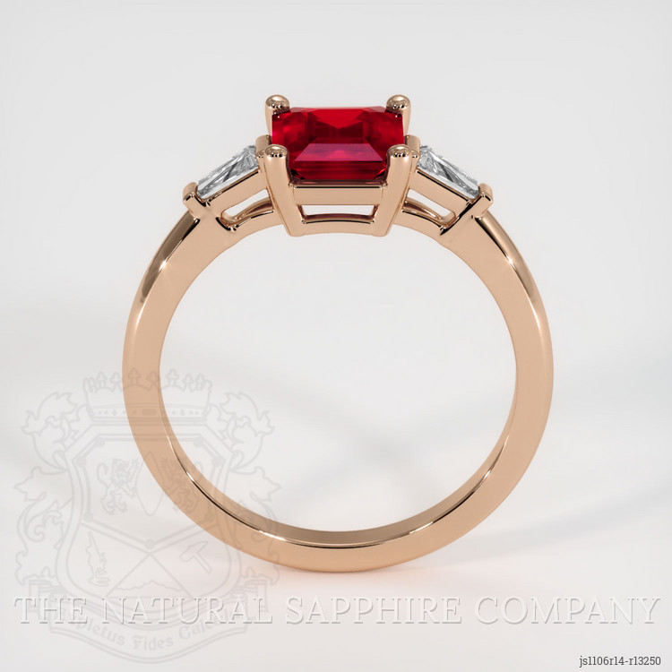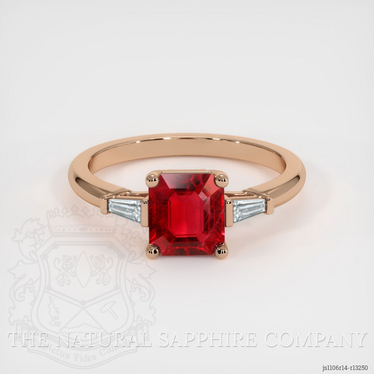 The ring features a beautiful, transparent 1.26 carat asscher - octagon shape red ruby with the dimensions of 6.72 x 6.00 x 3.05 mm and a step cut. It has a clarity grade of very slightly included (evaluated at eye level), intense color saturation, and an excellent polish. The origin of this ruby is Mozambique.