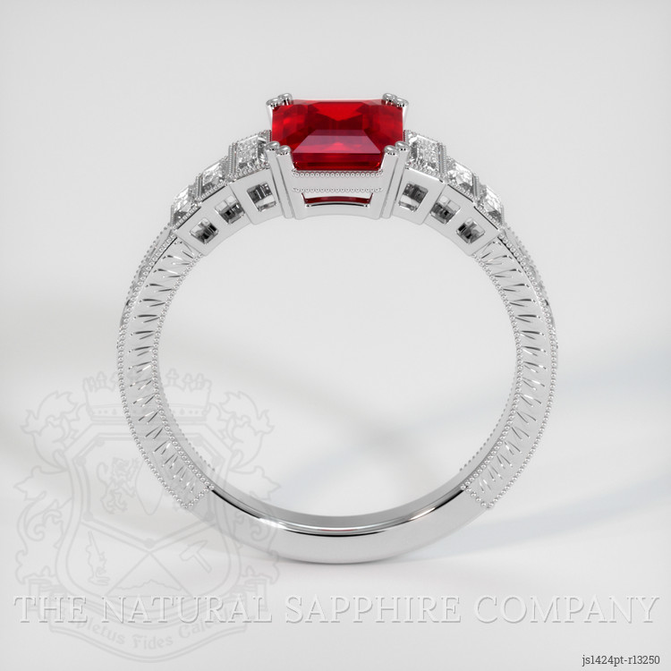 The ring features a beautiful, transparent 1.26 carat asscher - octagon shape red ruby with the dimensions of 6.72 x 6.00 x 3.05 mm and a step cut. It has a clarity grade of very slightly included (evaluated at eye level), intense color saturation, and an excellent polish. The origin of this ruby is Mozambique.