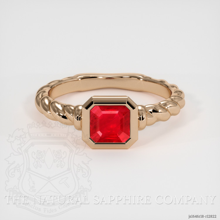 The men's ring features a beautiful, transparent 1.27 carat asscher - octagon shape red ruby with the dimensions of 6.04 x 6.00 x 3.37 mm and a asscher cut. It has a clarity grade of very slightly included (evaluated at eye level), vivid color saturation, and an excellent polish. The origin of this ruby is Mozambique.