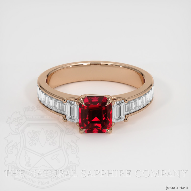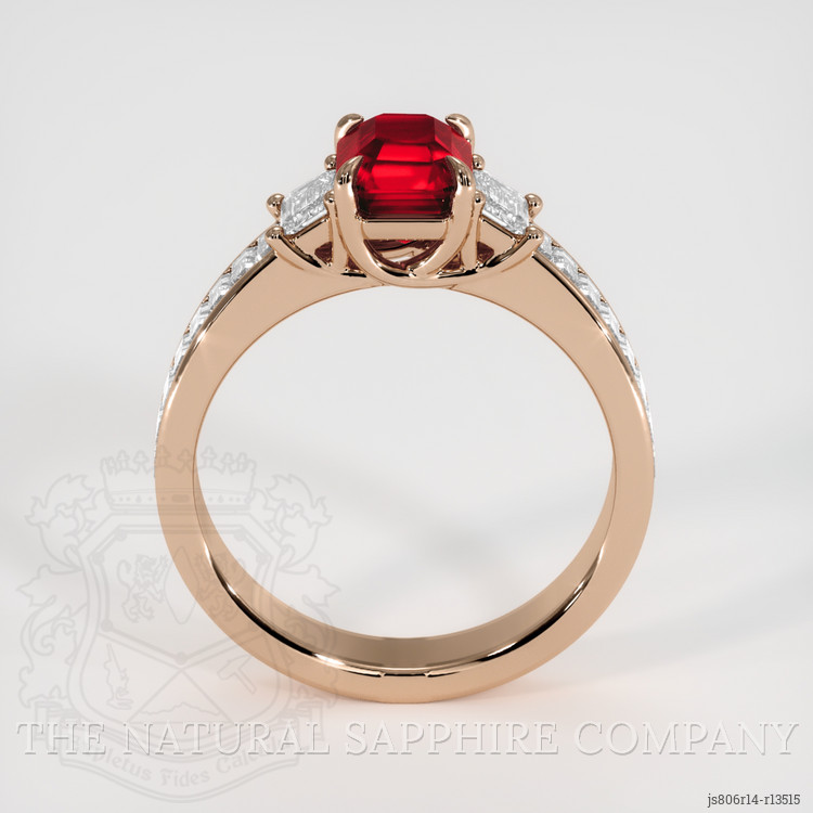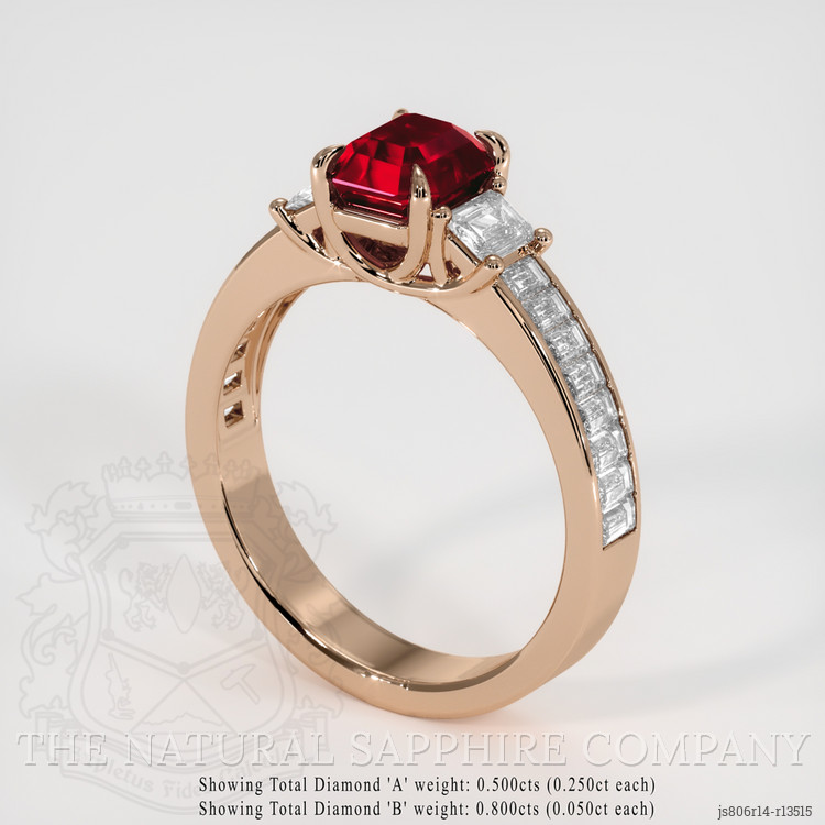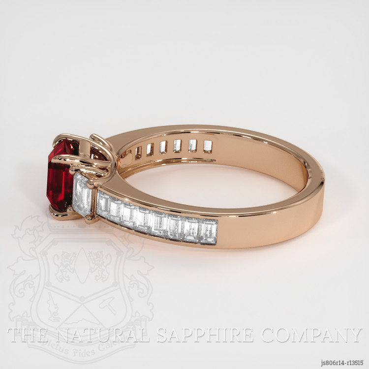 Surrounding this remarkable ruby are dazzling white diamonds, each carefully selected to complement the centerpiece. The ring features emerald cut diamonds, weighing approximately 0.50 carats, with a clarity grade of Very Slightly Included (VS1, VS2) and a color grade of E, ensuring near colorless purity and exceptional brilliance. These emerald cut diamonds provide an elegant parallel to the ruby with their elongated rectangular shapes that accentuate the length of the ring. Further enhancing this setting are additional white baguette-shaped diamonds, totaling approximately 0.80 carats. With identical clarity and color grading, these diamonds bridge harmony between the sophisticated ruby and the lush rose gold.