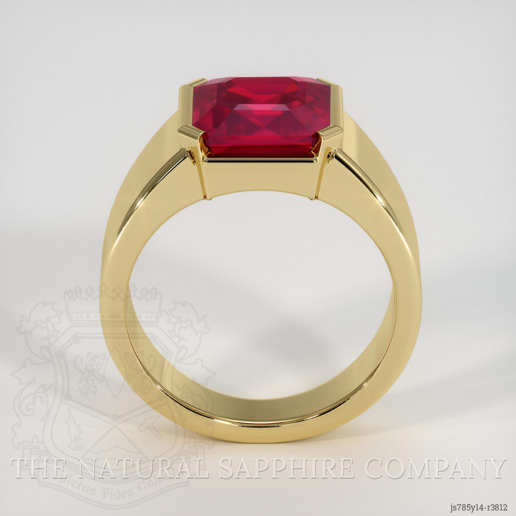 The ring is entirely set in 18K yellow gold, which not only adds to the luxurious feel but also complements the deep red hues of the ruby perfectly. The 18K yellow gold setting provides a durable and yet elegant frame that enhances the visibility and appeal of the central ruby. The smooth, polished finish of the band accentuates the intricacy of the Asscher cut ruby, creating an exquisite balance between the gemstone and its setting. The broad, simple lines of the gold setting allow the bold, vibrant nature of the ruby to take center stage, revealing a harmonious design that has both modern simplicity and classic elegance.