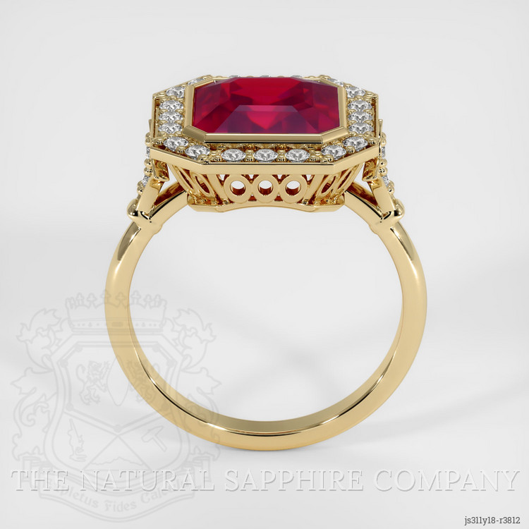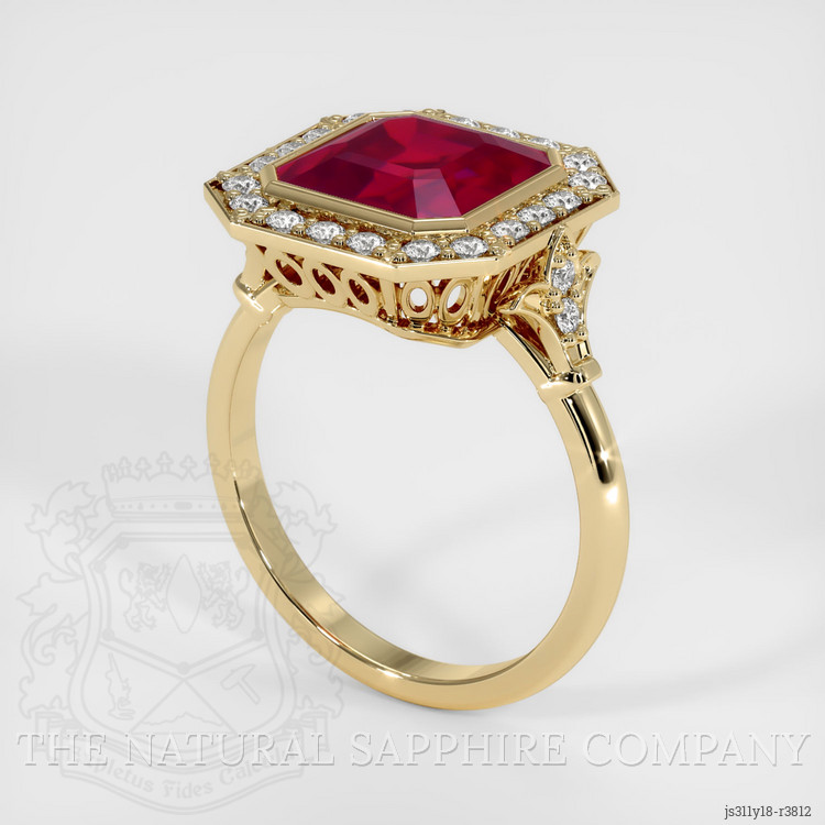 The ring features a beautiful, transparent C.Dunaigre certified Intense Red 4.21 carat asscher - octagon shape red ruby with the dimensions of 8.84 x 8.70 x 5.04 mm and a asscher cut. It has a clarity grade of very slightly included (evaluated at eye level), vivid color saturation, and an excellent polish. The origin of this ruby is Burma (Myanmar).