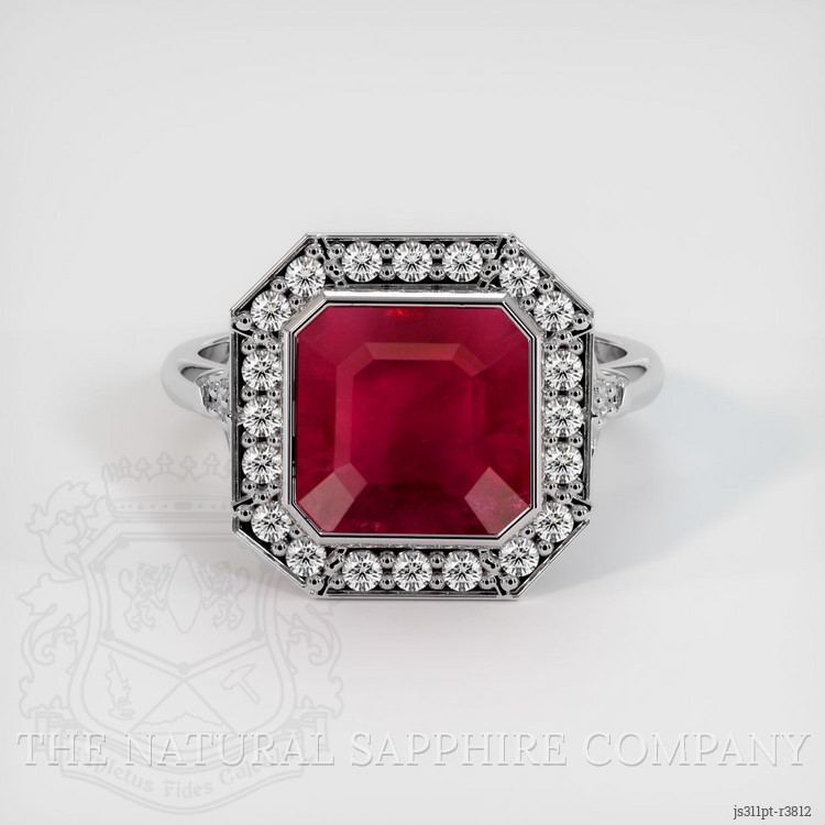 The ring features a beautiful, transparent C.Dunaigre certified Intense Red 4.21 carat asscher - octagon shape red ruby with the dimensions of 8.84 x 8.70 x 5.04 mm and a asscher cut. It has a clarity grade of very slightly included (evaluated at eye level), vivid color saturation, and an excellent polish. The origin of this ruby is Burma (Myanmar).