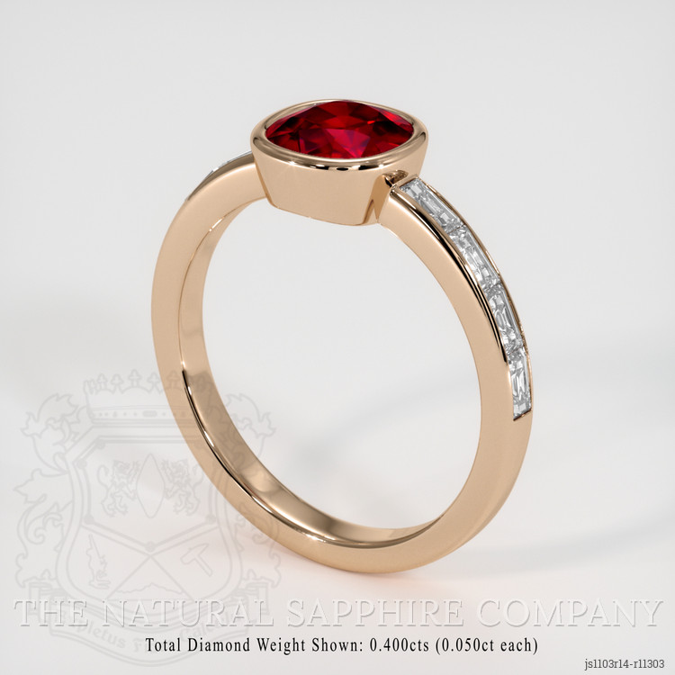 Enhancing the captivating beauty of the ruby are the impeccably crafted white baguette diamonds, weighing approximately 0.40 carats. With a clarity of Very Slightly Included (VS1, VS2) and an exquisite color grade of E, these diamonds are arranged in a sleek, straight composition, offering a perfect contrast to the vivid ruby. Set in luxurious 18K Rose gold, the combination accentuates the warmth of the central stone while providing a modern elegance unmatched by other designs currently on the market. The choice of 18K Rose gold not only elevates the aesthetic appeal of the ring but also ensures significant durability, standing resilient against daily wear much like our other high-end competitors, though presenting a uniquely stylish edge.