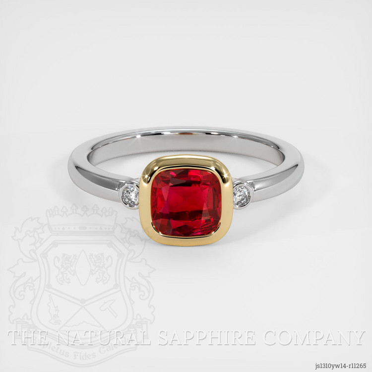 The ring features a beautiful, transparent GIA certified Red 1.37 carat cushion shape red ruby with the dimensions of 6.09 x 6.06 x 3.73 mm and a mixed brilliant cut. It has a clarity grade of very slightly included (evaluated at eye level), intense color saturation, and an excellent polish. The origin of this ruby is Mozambique.