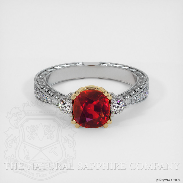 The ring features a beautiful, transparent GRS certified Vivid Red “Vibrant” 1.50 carat cushion shape red ruby with the dimensions of 6.62 x 6.31 x 4.26 mm and a mixed brilliant cut. It has a clarity grade of very slightly included (evaluated at eye level), vivid color saturation, and an excellent polish. The origin of this ruby is Mozambique.