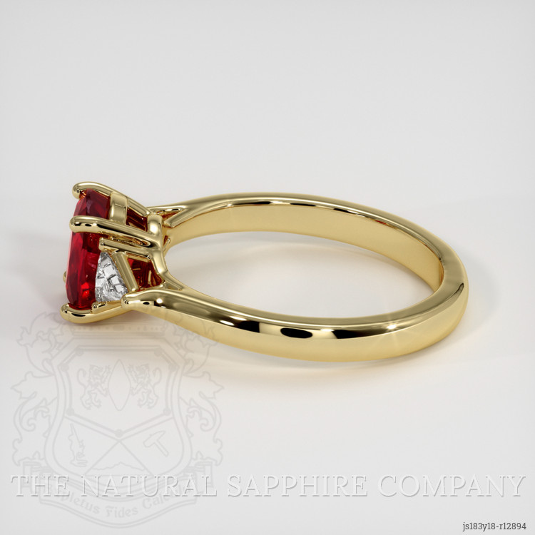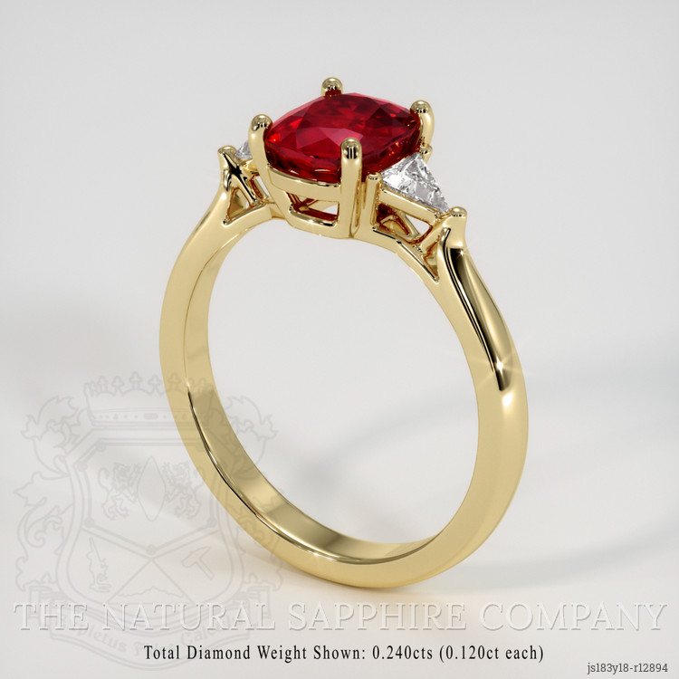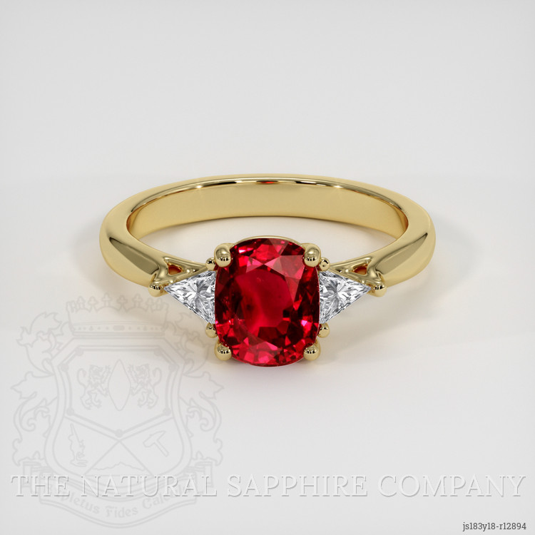 In your search for the ideal engagement ring or that rare gemstone to add to your collection. Your quest ends with this exquisite ring. It is designed to meet the highest standards of luxury and elegance. The centerpiece of this ring is a stunning 1.64 carat cushion shape red ruby. It measures 7.25 x 5.94 x 3.90 mm. It features a mixed brilliant cut, ensuring that it sparkles brilliantly in every light. The ruby boasts a vivid color saturation, perfect polish, and a clarity grade of very slightly included, evaluated at eye level. Sourcing this magnificent ruby from Thailand, also historically known as Siam, adds to the gem's allure and mystery. Accompanying the ruby are white trillion-shaped diamonds, weighing approximately 0.24 carats in total, with individual weights of around 0.12 carats each. The diamonds have a clarity grade of Very Slightly Included (VS1, VS2) and an exceptional color grade of E, adding to the ring’s brilliance and elegance. Adding an eco-friendly touch to its beauty, this ring is exquisitely set in entirely 18K yellow gold. The use of sustainable materials in crafting this piece reflects a deep consideration for the environment. It underscores the commitment to not only provide beauty but also sustainability. This ring is a testament to refined taste and responsible sourcing, making it a perfect solution for your search for unparalleled elegance and ethical craftsmanship.