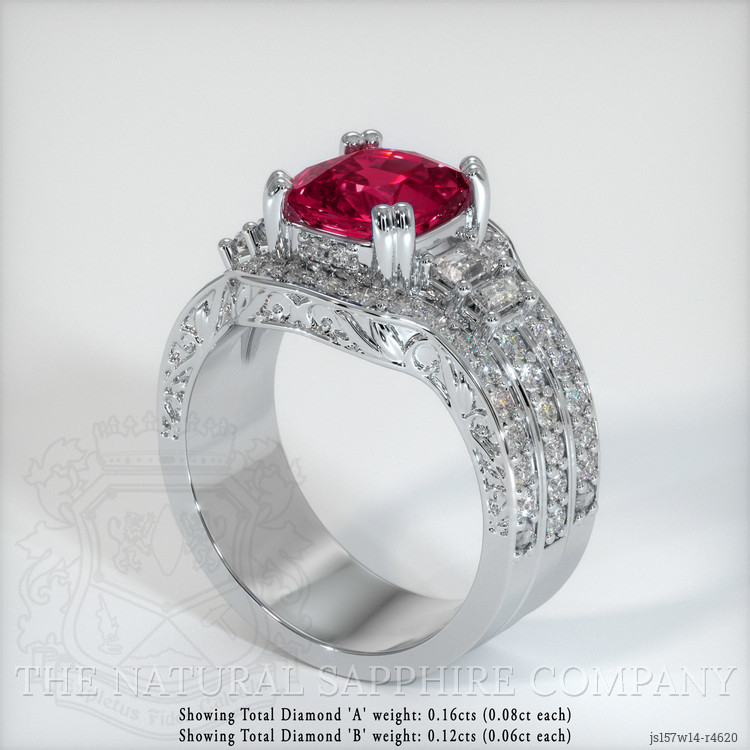 The ring features a beautiful, transparent GRS certified Red 2.76 carat cushion shape red ruby with the dimensions of 7.80 x 7.74 x 4.63 mm and a mixed brilliant cut. It has a clarity grade of very slightly included (evaluated at eye level), vivid color saturation, and an excellent polish. The origin of this ruby is Burma (Myanmar).