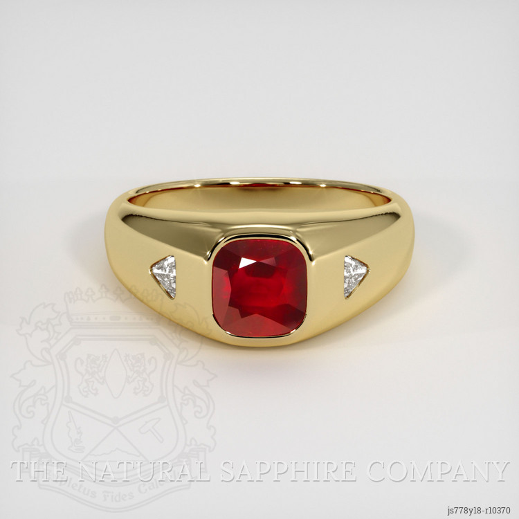 Discover the ultimate statement of elegance and sophistication with this exquisite men's ring. Crafted meticulously for those who seek nothing but the finest, this piece promises to end the search for luxury and perfection. Whether you're on the hunt for the ideal engagement ring or a unique gemstone to add to your collection, this ring assures you that your quest concludes here. The centerpiece is a stunning 2.98 carat cushion-shaped red ruby, showcasing the perfect balance of transparency and deep red allure certified by GRS. Its dimensions of 7.80 x 7.33 x 5.28 mm and a mixed brilliant cut ensure remarkable light performance, outshining other cuts and styles effortlessly. With a clarity grade of very slightly included, evaluated at eye level, this ruby offers vivid color saturation and an excellent polish, elevating it to a true gemstone masterpiece originating from Mozambique. Complementing the ruby's fiery brilliance are two white trillion-shaped diamonds, weighing approximately 0.24 carats. Their very slightly included clarity (VS1, VS2) and color grade of E enhance the overall allure, adding a subtle sparkle that elevates the entire piece. These diamonds, set harmoniously into the band, highlight the central ruby and create a balanced yet striking visual appeal. The entire ring is enveloped in opulent 18K yellow gold, which not only complements the deep red ruby but also adds a touch of regal flair to the design. The artistry and craftsmanship in creating this ring are exquisite, making it a perfect choice for those who cherish beauty and elegance. This ring is more than just jewelry; it's an embodiment of sophistication and style. Experience the unparalleled elegance and charm that this ring brings, showcasing your taste and refinement, ensuring that it meets and exceeds all your expectations for luxury and beauty.