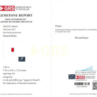 The ring features a beautiful, transparent GRS certified Vivid Red “Pigeon’s Blood” 1.04 carat emerald cut shape red ruby with the dimensions of 7.77 x 4.91 x 2.33 mm and a step cut. It has a clarity grade of eye clean (evaluated at eye level), vivid color saturation, and an excellent polish. The origin of this ruby is Mozambique.
