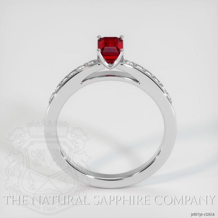 The ring features a beautiful, transparent 0.75 carat emerald shape red ruby with the dimensions of 6.19 x 3.92 x 2.85 mm and a step cut. It has a clarity grade of eye clean (evaluated at eye level), vivid color saturation, and an excellent polish. The origin of this ruby is Mozambique.