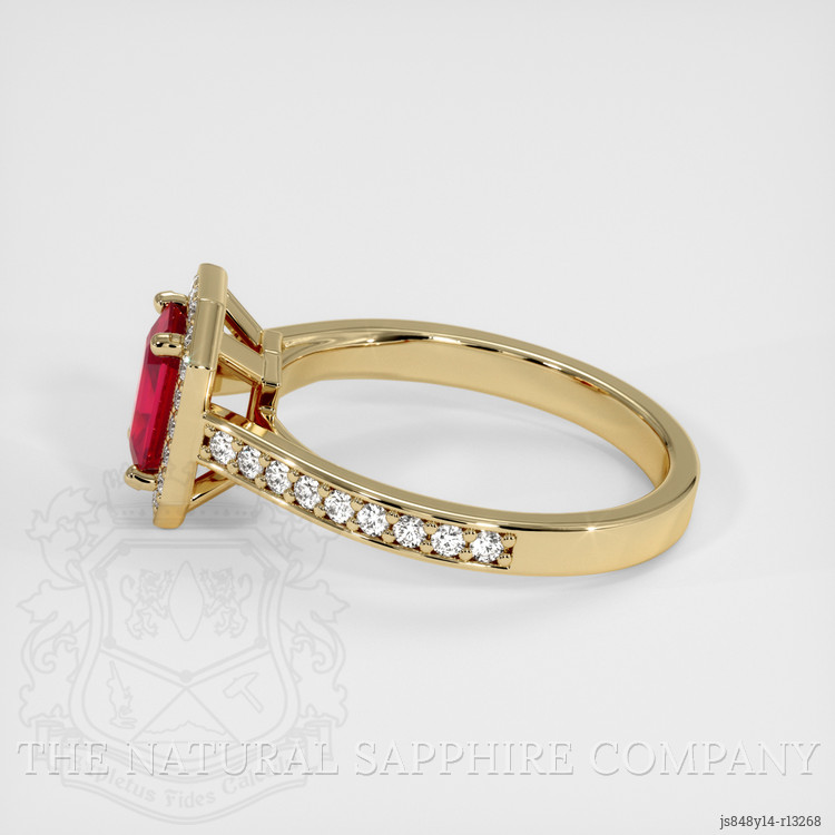 Flanking this magnificent ruby are intricately selected white round shaped diamonds, enhancing the ring's allure. These diamonds, totaling approximately 0.455 carats, come with a clarity grade of VS1/VS2 and a color grade of F, ensuring superior quality and brilliance. These diamonds are carefully set to reflect light seamlessly, producing an enchanting sparkle that complements the vivid hue of the central ruby. Nestled in a polished 14K yellow gold setting, the contrast between the gold and the gemstones creates an unforgettable visual experience, echoing both luxury and artistry.