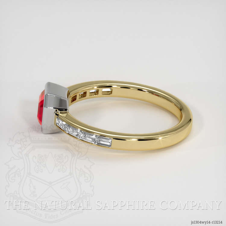 Accompanying the vibrant ruby are elegantly set white baguette diamonds with a total approximate weight of 0.40 carats. These diamonds possess a remarkable clarity grade of Very Slightly Included (VS1, VS2), which corresponds to minimal inclusions not visible to the naked eye, thus ensuring their dazzling transparency and vibrant sparkle. In terms of color, each diamond boasts a stringent E grade, known for its near colorless quality, reflecting each ray of light with unmatched brilliance. The harmony between the red hue of the ruby and the subtle gleam of these diamonds is further accentuated by the setting, which exquisitely merges 18K white gold and 18K yellow gold.