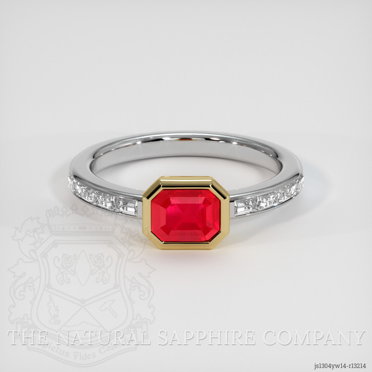 Accenting the vibrant ruby are straight baguette-shaped white diamonds, with an approximate weight of 0.40 carats. These diamonds are meticulously selected, boasting a clarity grade of Very Slightly Included and a color grade of E, guaranteeing an unparalleled sparkle and radiance. The harmonious blend of these precious stones creates a symphony of light that dances gracefully along the wearer's finger. Set amidst the richness of 18K yellow gold and 18K white gold, the ring promises longevity and distinction. The quality of the gold ensures that the band will withstand time and wear, making it not just a piece of jewelry, but an heirloom in the making.