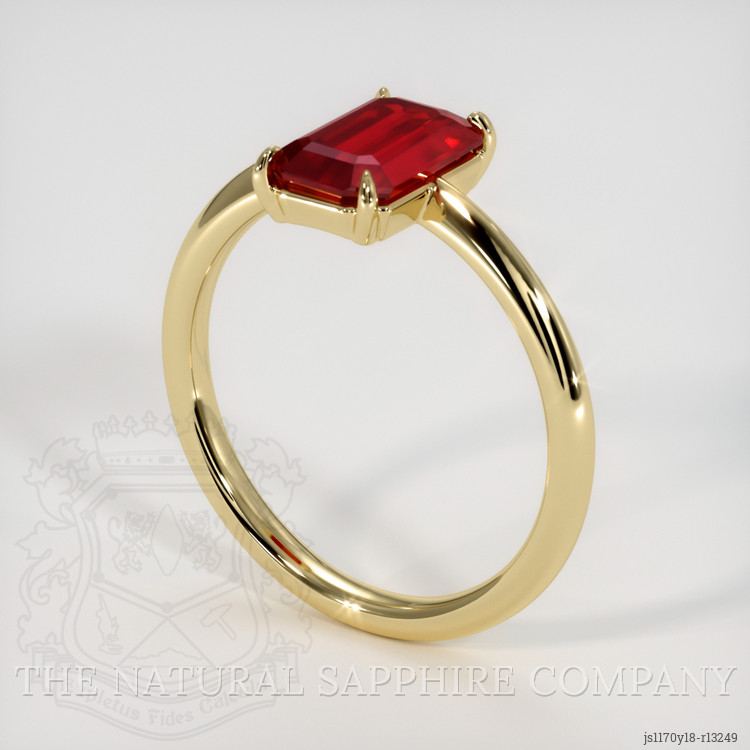 The ring features a beautiful, transparent IGI certified Red 1.20 carat emerald cut shape red ruby with the dimensions of 7.64 x 5.19 x 2.70 mm and a step cut. It has a clarity grade of very slightly included (evaluated at eye level), vivid color saturation, and an excellent polish. The origin of this ruby is Mozambique.