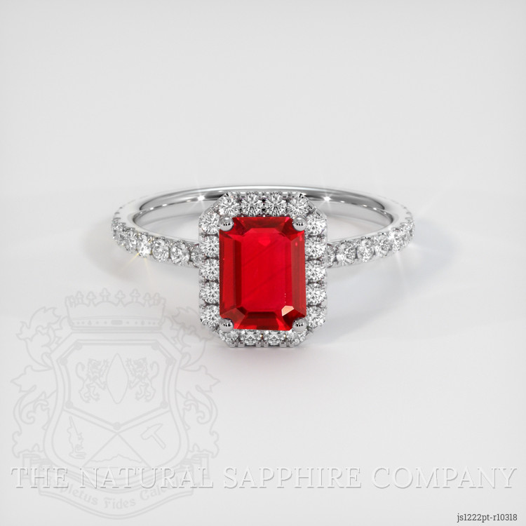 The ring features a beautiful, transparent 1.20 carat emerald cut shape red ruby with the dimensions of 7.24 x 5.38 x 2.45 mm and a step cut. It has a clarity grade of eye clean (evaluated at eye level), intense color saturation, and an excellent polish. The origin of this ruby is Mozambique.