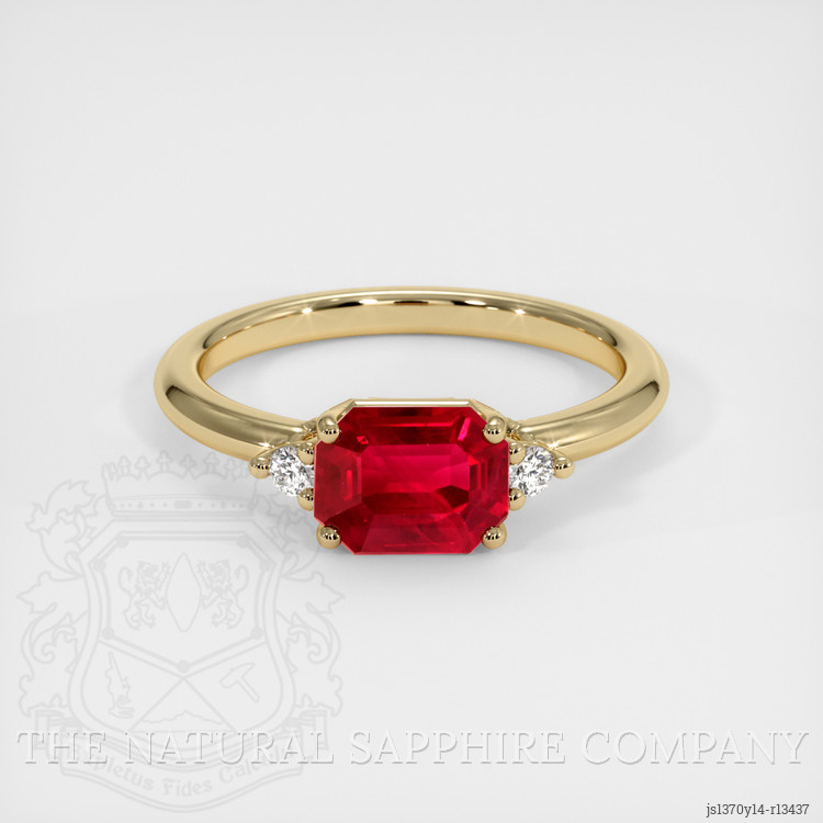 The ring features a beautiful, transparent GIA certified Red 1.61 carat emerald cut shape red ruby with the dimensions of 7.41 x 5.64 x 3.69 mm and a emerald cut. It has a clarity grade of very slightly included (evaluated at eye level), intense color saturation, and an excellent polish. The origin of this ruby is Burma (Myanmar).