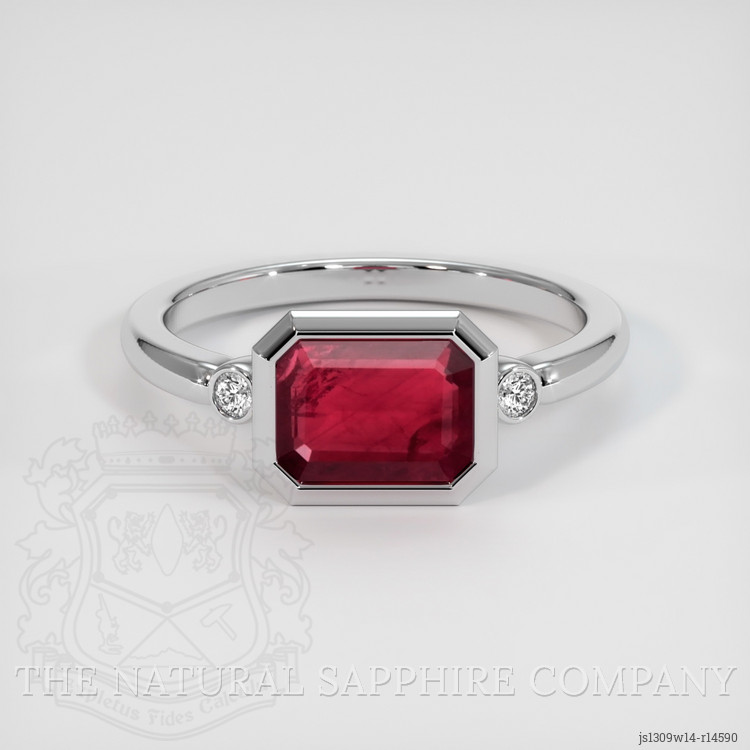 The ruby’s allure is elegantly complemented by white round-shaped natural diamonds nestled discreetly alongside the central gemstone. These diamonds, boasting a total weight of 0.05 carats, hold a clarity grade of Very Slightly Included (VS1, VS2) and radiate with a color grade of F. Craftsmanship of this caliber ensures that each diamond catches the light with a distinctive brilliance, setting off the ruby's intensity with perfectly harmonized splendor. The fusion of these stones on a 14K white gold band delivers a stunning visual contrast, bringing forth an artful balance between warmth and purity, indulgence and restraint.