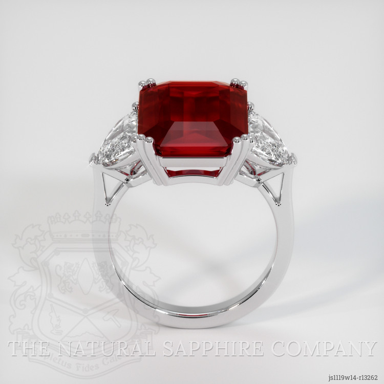 The ring features a beautiful, transparent C.Dunaigre certified Intense Red 10.01 carat emerald cut shape red ruby with the dimensions of 16.34 x 10.90 x 4.77 mm and a step cut. It has a clarity grade of eye clean (evaluated at eye level), vivid color saturation, and an excellent polish. Enhancement: heat treated. The origin of this ruby is Mozambique.