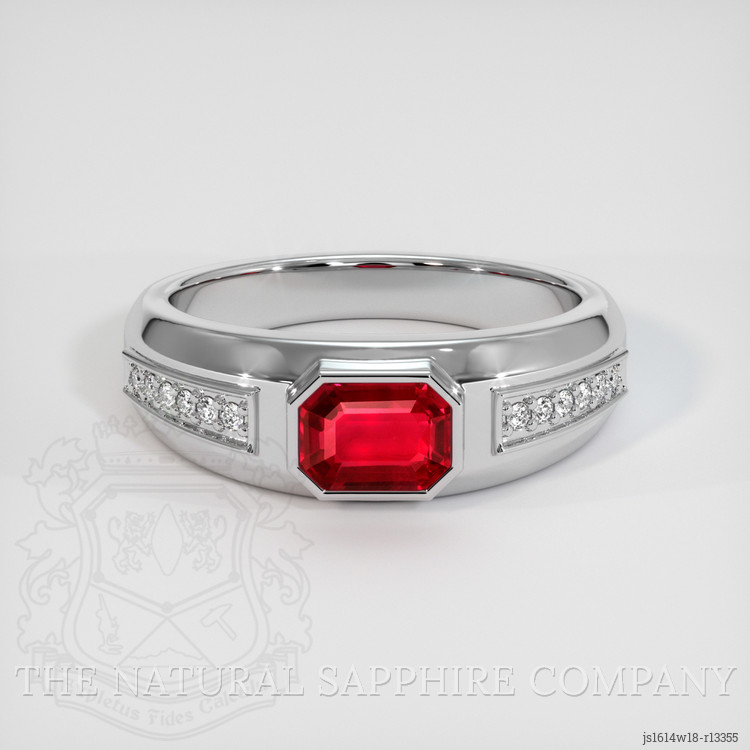 The men's ring showcases a stunning, transparent GIA certified red ruby with a weight of 2.01 carats. This gemstone is expertly cut into an elegant emerald shape and boasts dimensions of 7.71 x 5.71 x 3.95 mm. The clarity grade of the ruby is eye clean, meaning it appears flawless to the naked eye. Its color saturation is intense, contributing to its vibrant and captivating appearance. This exquisite ruby originated from Mozambique, a country renowned for producing high-quality gemstones. In addition to the ruby, the ring features white round shaped diamonds weighing approximately 0.189 carats. These diamonds carry a clarity grade of VS1/VS2, ensuring minimal inclusions that are not visible without magnification. The diamonds are also graded F for color, indicating a high level of whiteness and brilliance. Setting the entire piece in 18K white gold enhances the luxurious feel of the ring. This choice of metal not only highlights the gemstones but also offers a classic and sophisticated appearance. The design of the ring is versatile, allowing it to be worn alone for a bold statement or stacked with other rings for a more layered and personalized look. Buyers seeking quality and elegance will surely appreciate this piece, as the meticulous craftsmanship and superior materials speak volumes about its value and appeal.