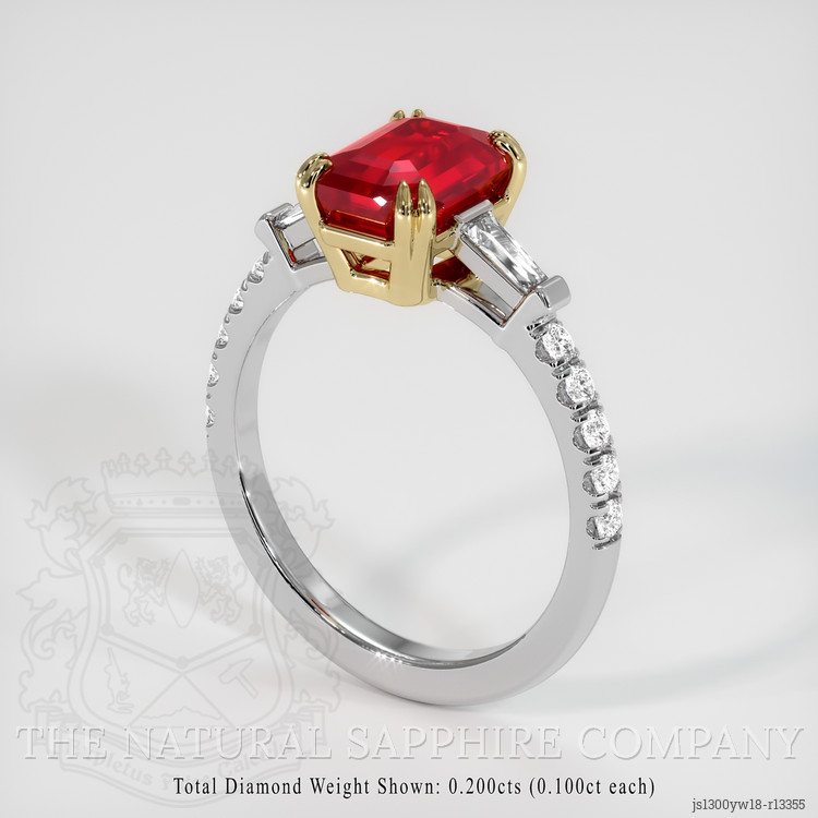 Encased in an 18K yellow and white gold setting, labeled JS1300, the ruby's arresting color is magnificently offset by the luster of accompanying diamonds. The pair of sidestones, each weighing 0.1 carats, radiate their own brilliance, boasting an E color grade that underscores their premium standing. Adorning the quarter shank, diamonds with a combined weight of 0.18 carats add a discreet yet stunning accent to the ring. Their F grade and round shape enhance the overall aesthetic, capturing and reflecting light with every movement. This jewel is not just an accessory, it embodies elegance and showcases our dedication to presenting the finest pieces.