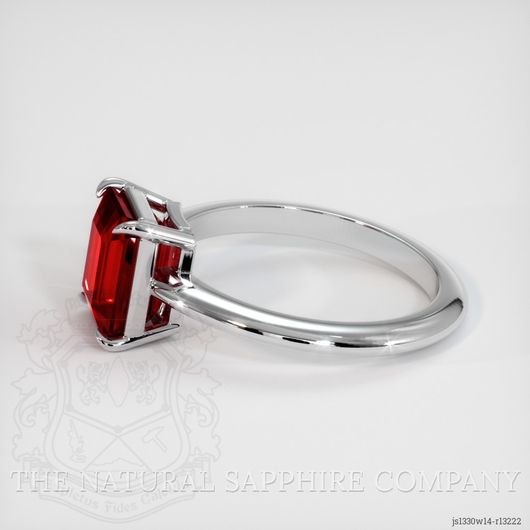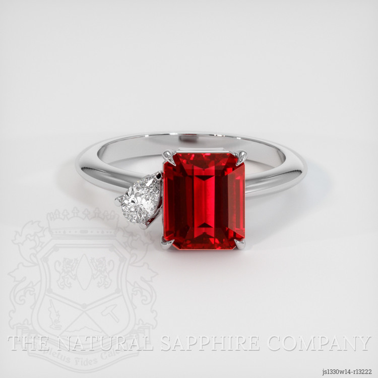 The ring features a beautiful, transparent GRS certified Vivid Red “Pigeon’s Blood” 3.18 carat emerald cut shape red ruby with the dimensions of 8.30 x 6.93 x 5.04 mm and a step cut. It has a clarity grade of eye clean (evaluated at eye level), vivid color saturation, and an excellent polish. The origin of this ruby is Mozambique.