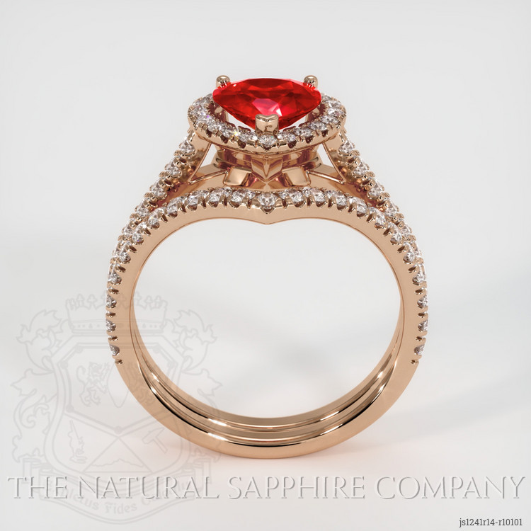 The ring features a beautiful, transparent 0.81 carat heart shape red ruby with the dimensions of 6.01 x 6.07 x 2.71 mm and a mixed brilliant cut. It has a clarity grade of eye clean (evaluated at eye level), vivid color saturation, and an excellent polish. The origin of this ruby is Mozambique.