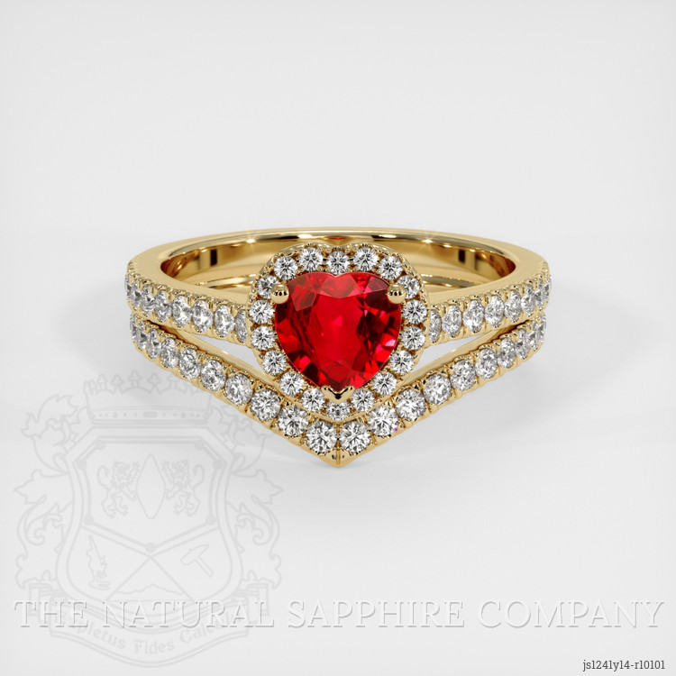 The ring features a beautiful, transparent 0.81 carat heart shape red ruby with the dimensions of 6.01 x 6.07 x 2.71 mm and a mixed brilliant cut. It has a clarity grade of eye clean (evaluated at eye level), vivid color saturation, and an excellent polish. The origin of this ruby is Mozambique.