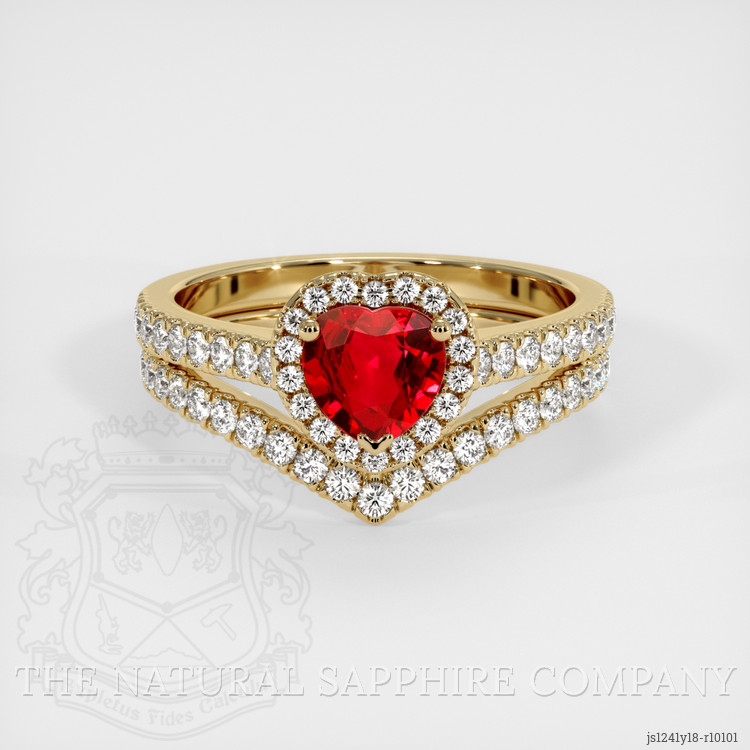 The ring features a beautiful, transparent 0.81 carat heart shape red ruby with the dimensions of 6.01 x 6.07 x 2.71 mm and a mixed brilliant cut. It has a clarity grade of eye clean (evaluated at eye level), vivid color saturation, and an excellent polish. The origin of this ruby is Mozambique.