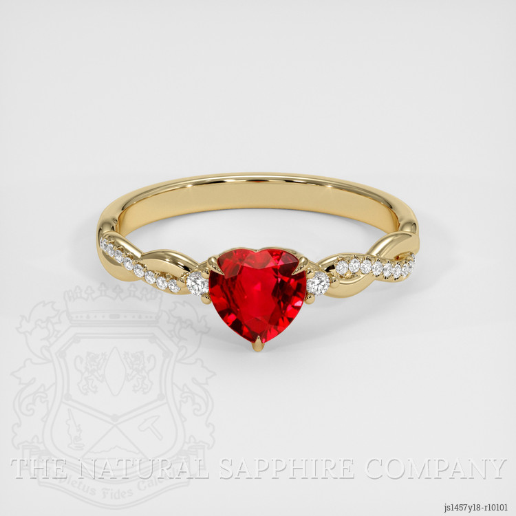 At its core lies an exquisite, transparent heart-shaped red ruby, weighing 0.81 carats. With dimensions of 6.01 x 6.07 x 2.71 mm, this masterpiece of a gemstone is cut in a mixed brilliant style, designed to maximize its inner spark. The ruby boasts a clarity grade of eye clean (when evaluated at eye level) and a vivid color saturation. Expertly polished to an exceptional standard. This gem originates from the coveted mines of Mozambique, a source known for producing rubies of extraordinary quality.