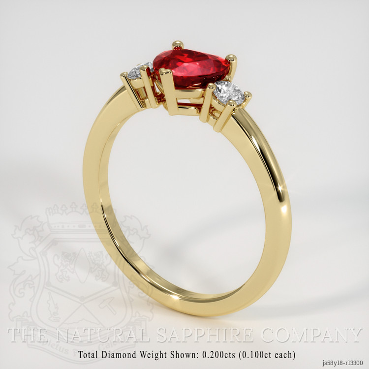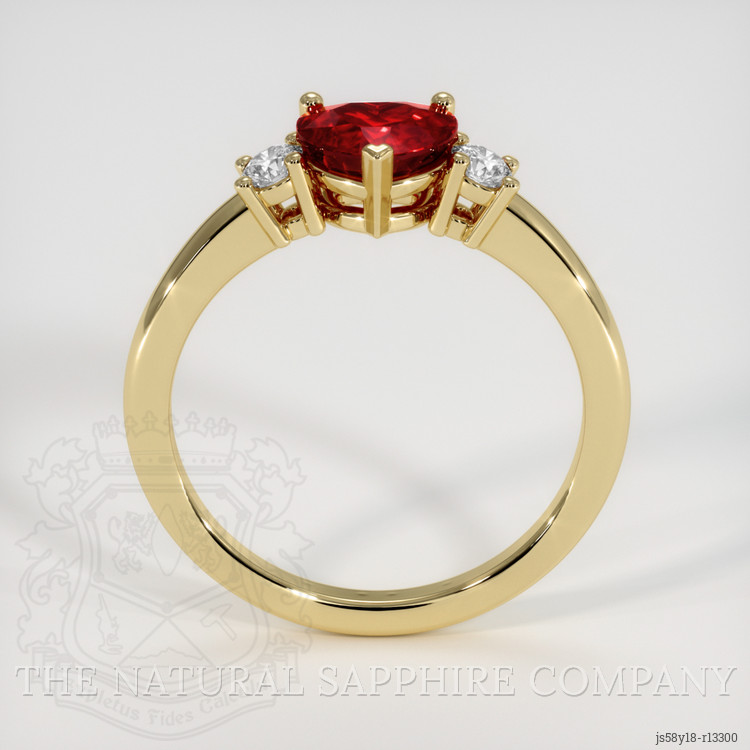 Encased in an elegant 18K Yellow Gold setting, identified as JS58, this ruby is flanked by diamonds, each 0.1 carat, their E-grade color sparkling in harmony with the central ruby. Their clarity of very slightly included (VS1, VS2) only accentuates the ruby's vivid saturation.