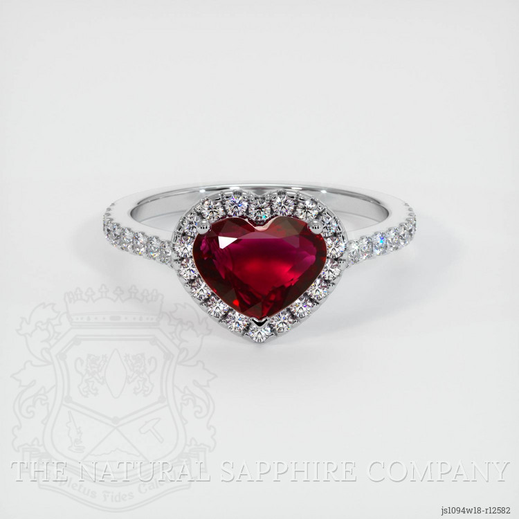 The ring features a beautiful, transparent GIA certified Red 1.65 carat heart shape red ruby with the dimensions of 6.37 x 8.35 x 3.58 mm and a mixed brilliant cut. It has a clarity grade of eye clean (evaluated at eye level), vivid color saturation, and an excellent polish. The origin of this ruby is Mozambique.