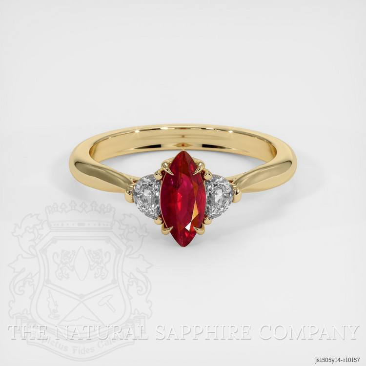 The ring features a beautiful, transparent 0.57 carat marquise shape pinkish red ruby with the dimensions of 8.19 x 3.94 x 2.52 mm and a mixed brilliant cut. It has a clarity grade of very slightly included (evaluated at eye level), vivid color saturation, and an excellent polish. The origin of this ruby is Mozambique.