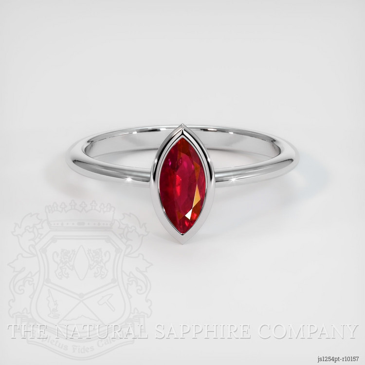 The ring features a beautiful, transparent 0.57 carat marquise shape pinkish red ruby with the dimensions of 8.19 x 3.94 x 2.52 mm and a mixed brilliant cut. It has a clarity grade of very slightly included (evaluated at eye level), vivid color saturation, and an excellent polish. The origin of this ruby is Mozambique.