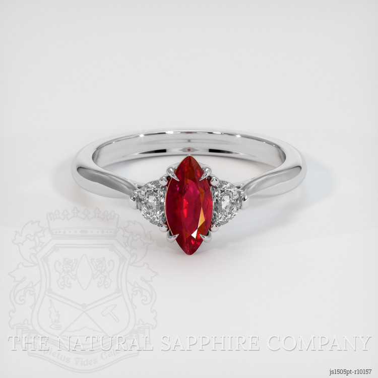 The ring features a beautiful, transparent 0.57 carat marquise shape pinkish red ruby with the dimensions of 8.19 x 3.94 x 2.52 mm and a mixed brilliant cut. It has a clarity grade of very slightly included (evaluated at eye level), vivid color saturation, and an excellent polish. The origin of this ruby is Mozambique.