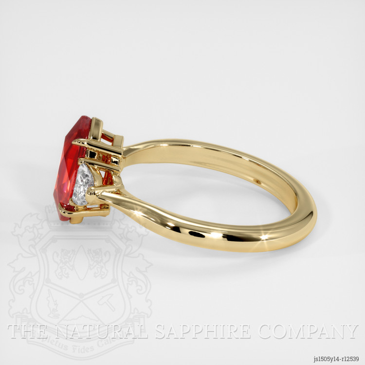 The ring features a beautiful, transparent 1.50 carat marquise shape red ruby with the dimensions of 10.60 x 5.08 x 3.19 mm and a mixed brilliant cut. It has a clarity grade of slightly included (evaluated at eye level), vivid color saturation, and an excellent polish. The origin of this ruby is Burma (Myanmar).