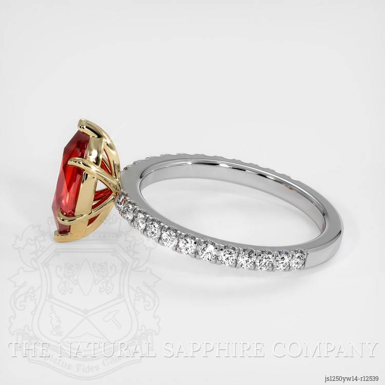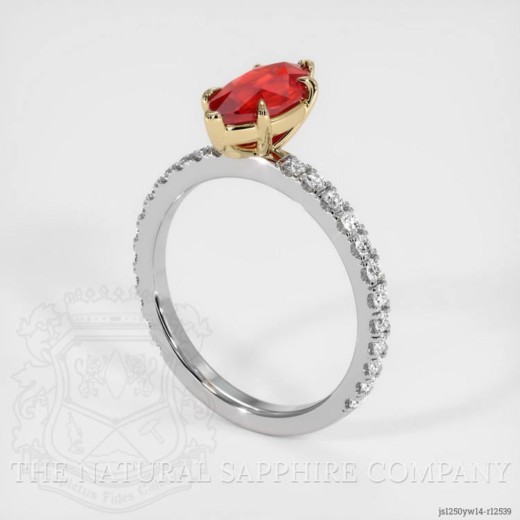 The ring features a beautiful, transparent 1.50 carat marquise shape red ruby with the dimensions of 10.60 x 5.08 x 3.19 mm and a mixed brilliant cut. It has a clarity grade of slightly included (evaluated at eye level), vivid color saturation, and an excellent polish. The origin of this ruby is Burma (Myanmar).