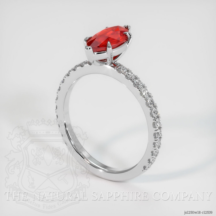 The ring features a beautiful, transparent 1.50 carat marquise shape red ruby with the dimensions of 10.60 x 5.08 x 3.19 mm and a mixed brilliant cut. It has a clarity grade of slightly included (evaluated at eye level), vivid color saturation, and an excellent polish. The origin of this ruby is Burma (Myanmar).