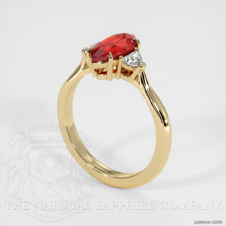 The ring features a beautiful, transparent 1.50 carat marquise shape red ruby with the dimensions of 10.60 x 5.08 x 3.19 mm and a mixed brilliant cut. It has a clarity grade of slightly included (evaluated at eye level), vivid color saturation, and an excellent polish. The origin of this ruby is Burma (Myanmar).
