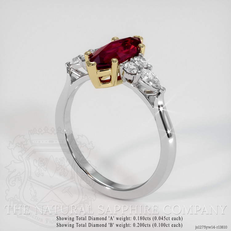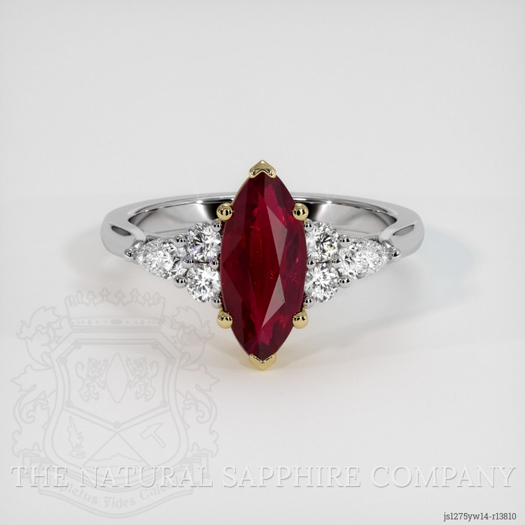 Indulge in the captivating allure of The Natural Ruby Company’s exquisite creation, where every glance unveils a story of elegance and sophistication. The heart of this luxurious ring is a rare, GRS certified Vivid Red “Pigeon’s Blood” ruby sourced from the fabled mines of Burma. At 1.61 carats, this marquise shape gem measures 11.74 x 5.09 x 3.27 mm, and its mixed brilliant cut reflects an exceptional vibrancy synonymous with the rarest rubies in the world. A vivid color saturation couples with a slightly included clarity, only discernible at eye level, confirming its authenticity and unrivaled natural beauty. This ruby’s enchanting hue is akin to the masterpieces crafted by legendary luxury houses, symbolizing prestige and opulence.