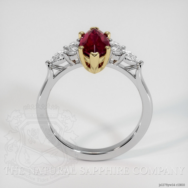 Encased around this regal gemstone are glittering white round and pear shaped diamonds, effortlessly balancing the composition with precision and grace. The round diamonds, weighing approximately 0.18 carats, and the pear shaped diamonds of approximately 0.20 carats, both hold a clarity grade of Very Slightly Included (VS1, VS2), and display superior color grades of F and E respectively. Their pristine, icy brightness enhances the ruby’s dramatic richness, reminiscent of the fine detailing found in collections by esteemed jewelry arts, where perfection is a standard and not a luxury.